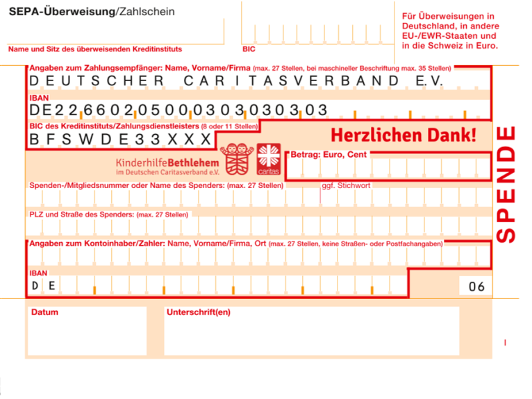 Hinweis:Seit dem 05.10.2025 prüfen Banken bei SEPA-Überweisungen, ob IBAN und Empfängername übereinstimmen. Bei Abweichungen kann es zu Verzögerungen kommen. Die SozialBank arbeitet an einer Lösung, damit auch Überweisungen an „Kinderhilfe Bethlehem im Deutschen Caritasverband e.V.“ korrekt verbucht werden. Bitte geben Sie bis dahin als Empfänger „Deutscher Caritasverband e.V.“ an. Herzlichen Dank!